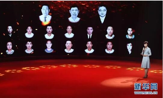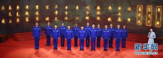 ▲在主持人的引導下,中船重工第七六〇研究所抗災搶險英雄群體中的14位同志(另外3位同志犧牲)參加發(fā)布儀式