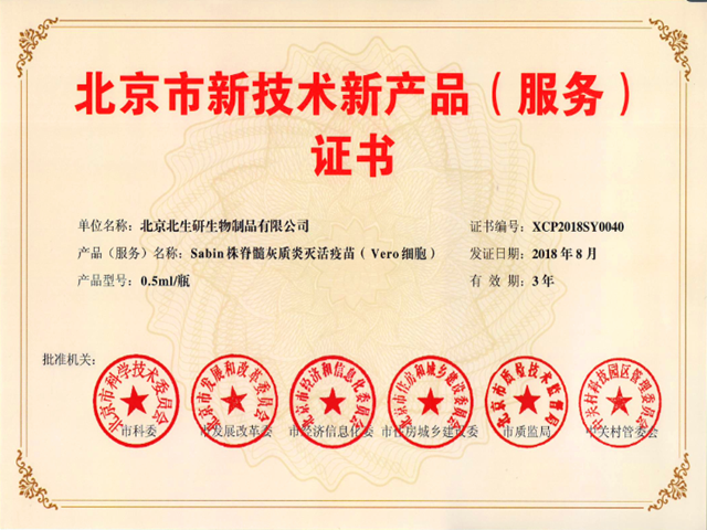 2018年9月7日,國藥中生北生研公司自主研發(fā)生產(chǎn)的Sabin株脊髓灰質(zhì)炎滅活疫苗(Vero細(xì)胞)(sIPV疫苗)經(jīng)過北京市科委、發(fā)改委、經(jīng)信委等六部門評(píng)審,獲得北京市新技術(shù)新產(chǎn)品證書。