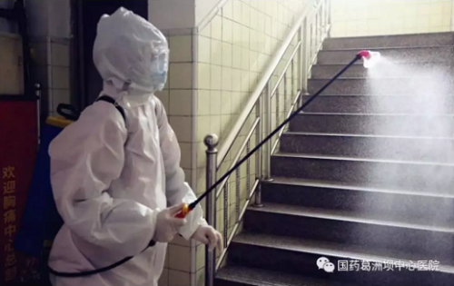 總務(wù)部李鳳峽對公共區(qū)域消毒處理