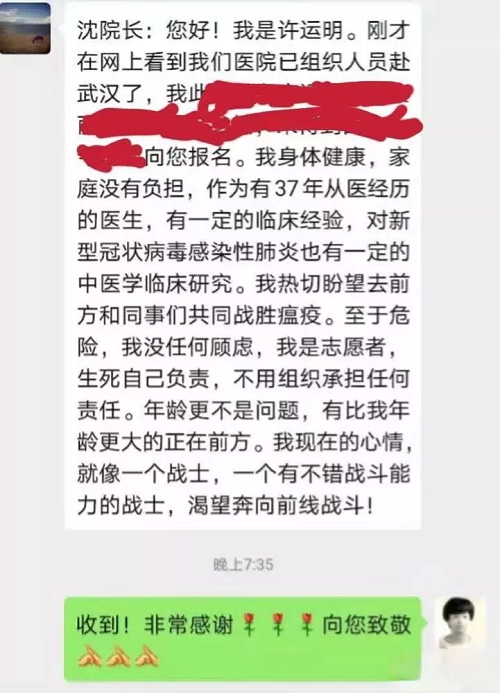 1月28日,揚(yáng)州市中醫(yī)院黨委書記、院長沈雨春收到一條特別的微信:“沈院長:您好!我是許運(yùn)明。我身體健康,家庭沒有負(fù)擔(dān),作為有37年從醫(yī)經(jīng)歷的醫(yī)生,有一定的臨床經(jīng)驗(yàn),對新型冠狀病毒感染性肺炎也有一定的中醫(yī)學(xué)臨床研究。我熱切盼望去一線和同事們共同戰(zhàn)勝瘟疫。至于危險(xiǎn),我沒任何顧慮,我是志愿者,生死自己負(fù)責(zé),不用組織承擔(dān)任何責(zé)任。年齡更不是問題,有比我年齡更大的正在前方。我現(xiàn)在的心情,就像一個(gè)戰(zhàn)士,一個(gè)有不錯(cuò)戰(zhàn)斗能力的戰(zhàn)士,渴望奔向前線戰(zhàn)斗!”許運(yùn)明同志作為天江藥業(yè)一名退休的老黨員,沖在一線,敢為人先,在這場全民戰(zhàn)“疫”中,展現(xiàn)了共產(chǎn)黨員的赤子之心。