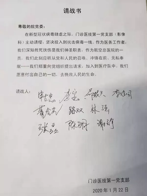 年近八旬的黃錫璆博士,還第一時間向組織遞交了請戰(zhàn)書,表達(dá)了作為共產(chǎn)黨員、愿隨時聽從組織安排,趕赴一線,參加疫情抗擊工作的決心。他寫道:“本人是共產(chǎn)黨員,與其他年青同事相比家中牽掛少,具有非典小湯山實(shí)戰(zhàn)經(jīng)驗(yàn)。本人向組織表示,隨時聽從組織召喚,隨時準(zhǔn)備突擊參加抗擊工作。”