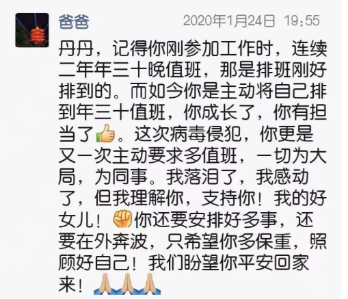 劉海生在微信群里發(fā)過這樣一段感言:“老婆和孩子春節(jié)都在醫(yī)院參加抗戰(zhàn)疫情,心里壓力好大!給自已和家人默默的鼓個勁,加個油。我們一定會平安的渡過疫情危機(jī),抗戰(zhàn)一定會取得勝利!祝家人安好,祝同學(xué)們安好,祝全國人民安好!對抗疫情!”