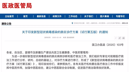第五版方案中還進(jìn)一步明確了中藥在這次疫情中發(fā)揮的重要作用,國(guó)家衛(wèi)建委、國(guó)家中藥管理局要求各有關(guān)醫(yī)療機(jī)構(gòu)在醫(yī)療救治工作中積極發(fā)揮中醫(yī)藥作用,加強(qiáng)中西醫(yī)結(jié)合,建立中西醫(yī)聯(lián)合會(huì)診制度,促進(jìn)醫(yī)療救治的良好效果。