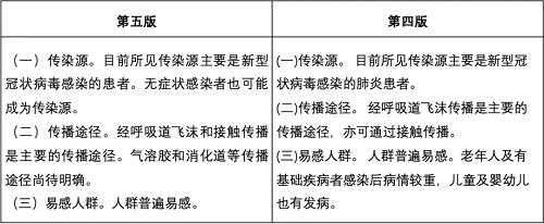 在第四版的基礎(chǔ)上,第五版修改了傳染源,進(jìn)一步明確無(wú)癥狀感染者也可能成為傳染源。傳播途徑更新為經(jīng)呼吸道飛沫和接觸傳播是主要的傳播途徑,氣溶膠和消化道等傳播途徑尚待明確。易感人群覆蓋到人群普遍易感。