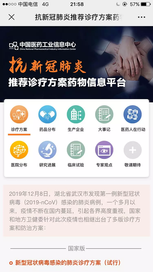 及時上線“抗新冠肺炎推薦診療方案藥物信息平臺”。國藥醫(yī)工總院下屬企業(yè)中國醫(yī)藥工業(yè)信息中心放棄春節(jié)休假、積極組織人員加班加點協(xié)助工信部消費品工業(yè)司和多省工信廳查詢各類醫(yī)用物資相關(guān)信息,并緊急聯(lián)系多家醫(yī)藥企業(yè),為國家應(yīng)急供應(yīng)保障提供支持。同時他們還用急行軍速度,于1月底緊急上線“抗新冠肺炎推薦診療方案藥物信息平臺”,該平臺共分診療方案、藥品分布、生產(chǎn)企業(yè)、醫(yī)藥人在行動、醫(yī)院分布、研究進(jìn)展、大事記和專家觀點等版塊。特別是藥品分布和生產(chǎn)企業(yè)板塊,充分利用了中國醫(yī)藥工業(yè)信息中心醫(yī)藥行業(yè)大數(shù)據(jù)平臺的優(yōu)勢,匯總了診療方案推薦的所有品種在全國的區(qū)域分布、商品名、企業(yè)、劑型、規(guī)格和批準(zhǔn)文號等信息,將為各地查詢抗新冠肺炎藥品來源提供數(shù)據(jù)支持。
