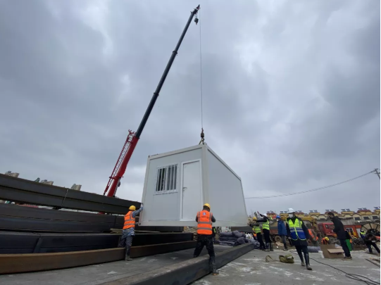 上午11時箱式板房首個模塊開始吊裝?,F(xiàn)場進度快速推進,首次使用的裝配式醫(yī)療病房是新型可周轉(zhuǎn)材料,拼裝速度快,保溫隔熱效果好。