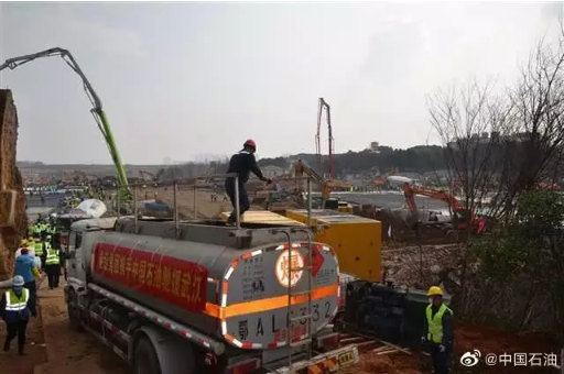 上午10點,兩輛載滿16噸柴油的中國石油油罐車,駛?cè)牖鹕裆结t(yī)院工地現(xiàn)場,為緊張施工的各類車輛、發(fā)電機、工程器械快速加注油品,保障施工過程緊湊高效持續(xù)。