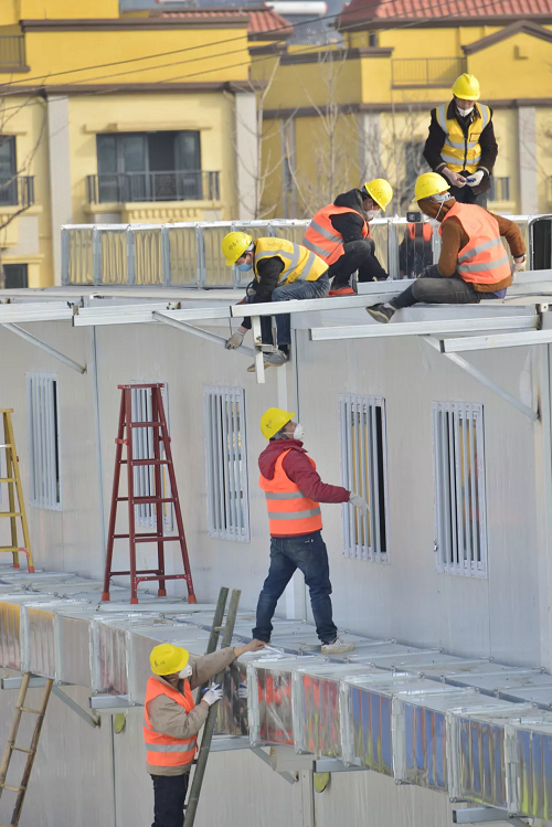 下午16時,中建三局等全部完成現(xiàn)場場地平整和回填,板房基礎混凝土澆筑完成約90%,完成300多個箱式板房骨架安裝,同時場外抓緊板房拼裝,完成約400個,吊至現(xiàn)場直接安裝。水電暖通、機電設備等材料全面到位,同步開始作業(yè)。