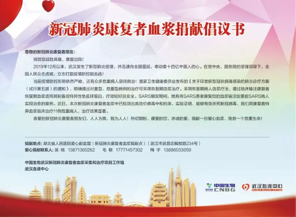 據(jù)中國生物介紹,這種新冠特免血漿制品,是由康復(fù)者捐獻(xiàn)的含高效價(jià)新冠病毒特異性抗體的血漿,經(jīng)過病毒滅活處理,并對(duì)抗新冠病毒中和抗體、多重病原微生物檢測(cè)后制備而成的,用于新冠肺炎危重患者的治療。為此,中國生物聯(lián)合武漢血液中心發(fā)布倡議書,懇請(qǐng)新冠肺炎康復(fù)者朋友獻(xiàn)出愛心捐獻(xiàn)血漿,力所能及地幫助仍處于危難之中的其他患者。