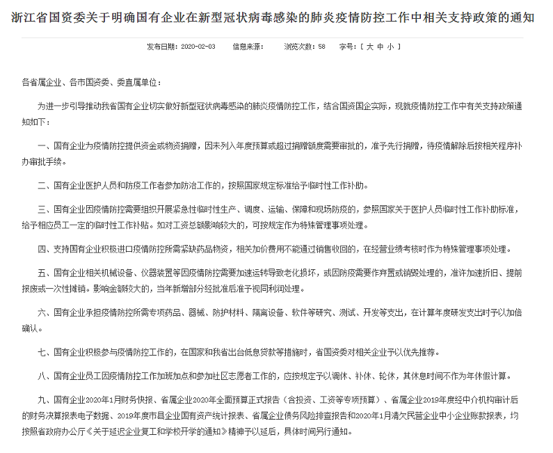 早在2月3日,為進一步引導推動企業(yè)切實做好新冠肺炎疫情防控工作,浙江省國資委印發(fā)《關(guān)于明確國有企業(yè)在新型冠狀病毒感染的肺炎疫情防控工作中相關(guān)支持政策的通知》,在經(jīng)營業(yè)績考核、捐贈審批、工資總額、研發(fā)支出等方面明確了九條措施,對所監(jiān)管企業(yè)積極參與疫情防控予以大力支持。