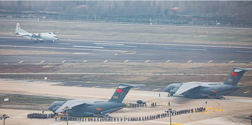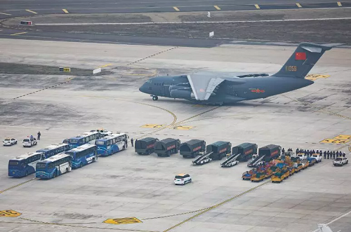 2月13日凌晨,空軍出動(dòng)包括中國(guó)自主研制的6架運(yùn)20在內(nèi)的3型11架運(yùn)輸機(jī),分別從烏魯木齊、沈陽(yáng)、西寧、天津、張家口、成都、重慶等7地機(jī)場(chǎng)起飛,向武漢空運(yùn)軍隊(duì)支援湖北醫(yī)療隊(duì)隊(duì)員和物資。上午9時(shí)30分許,11架運(yùn)輸機(jī)全部抵達(dá)武漢天河機(jī)場(chǎng)。