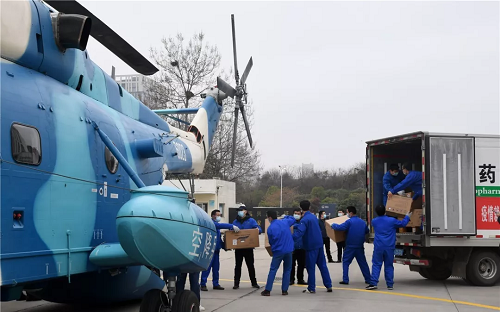 2月12日,應(yīng)湖北省疫情防控指揮部請(qǐng)求,中部戰(zhàn)區(qū)緊急調(diào)派由航空工業(yè)研制生產(chǎn)在駐鄂空降兵某空中突擊旅直升機(jī)團(tuán)服役的兩架國(guó)產(chǎn)直8大型運(yùn)輸直升機(jī),由武漢市向襄陽(yáng)、宜昌地區(qū)轉(zhuǎn)運(yùn)口罩、防護(hù)服、手套、藥品等600件共計(jì)4噸防疫醫(yī)療急需藥品和緊缺物資。