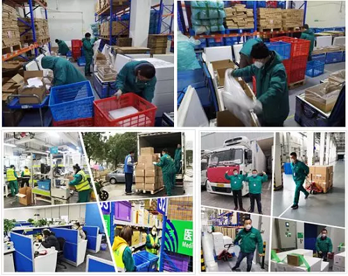 國藥物流各地子公司實行24小時接收發(fā)貨訂單,倉庫現(xiàn)場24小時值班。接到相關(guān)醫(yī)院的訂單后,2小時內(nèi)即將物資發(fā)出。配送員工以車為家,風(fēng)餐露宿、星夜兼程,克服低溫雨雪、高速封路等困難,以“逆行者”的果敢、“神行者”的速度,英勇馳騁于防抗疫情的各個戰(zhàn)場之間。