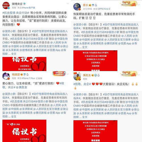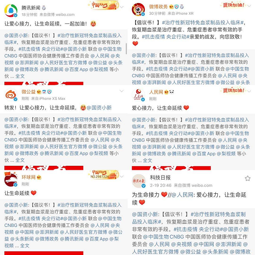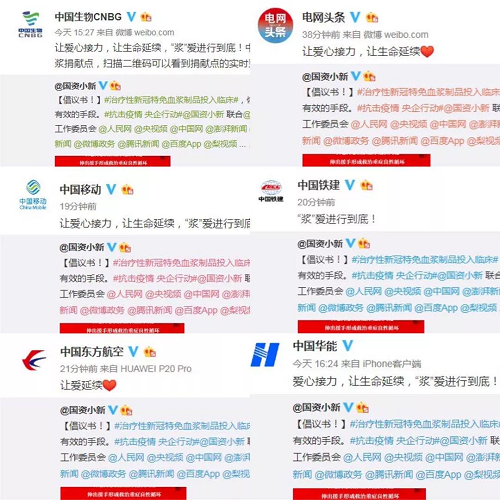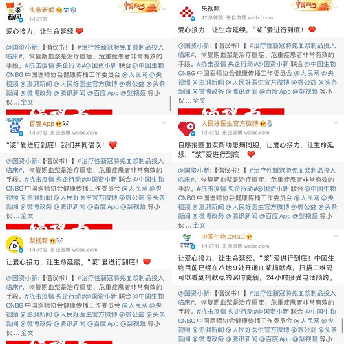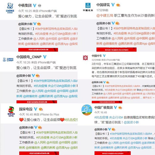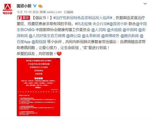 2月18日起,@國(guó)資小新 聯(lián)合中國(guó)生物、中國(guó)醫(yī)師協(xié)會(huì)健康傳播工作委員會(huì)、人民網(wǎng)、央視頻、中國(guó)網(wǎng)、澎湃新聞、人民好醫(yī)生官方微博、微公益、頭條新聞、微博政務(wù)、騰訊新聞、百度App、梨視頻等小伙伴,共同向新冠肺炎康復(fù)者發(fā)起愛(ài)心接力捐贈(zèng)血漿微倡議:懇請(qǐng)新冠肺炎康復(fù)者朋友獻(xiàn)出愛(ài)心,自愿捐獻(xiàn)血漿幫助患病同胞,讓愛(ài)心接力,讓生命延續(xù),“漿”愛(ài)進(jìn)行到底!