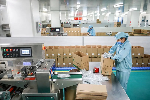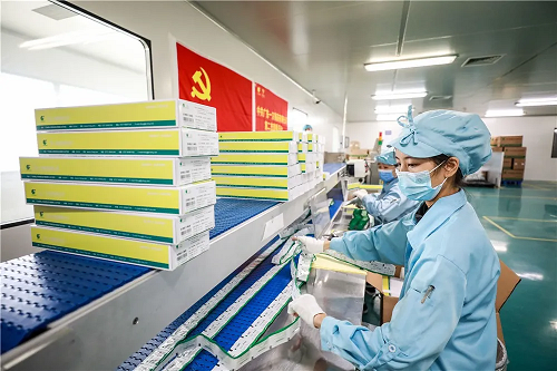 佩戴著口罩、穿著統(tǒng)一制服的工人們在生產(chǎn)線上作業(yè),迅速地將已內(nèi)包裝好的配方顆粒疊好放進外包裝盒里,并在包裝盒上貼上相應的產(chǎn)品標簽。這些產(chǎn)品經(jīng)過檢驗后即可供應市場。
