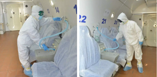 2月17日起,醫(yī)院對部分需要的新冠肺炎普通型患者進行了高壓氧治療。新冠肺炎患者入艙前,醫(yī)護人員對患者進行各項注意事項的宣教,入艙后操作人員通過對講系統(tǒng)再次對患者進行指導,確保患者佩戴口罩和吸氧面罩時做到無縫連接;在氧艙中,治療患者隔位就坐;對于不使用的吸氧口、排氧口使用乳膠手套綁扎,防止管道污染;每人配備紙巾及垃圾袋,供咳嗽時使用;患者出艙后,對高壓氧艙及所有相關物品進行嚴格終末消毒處理。