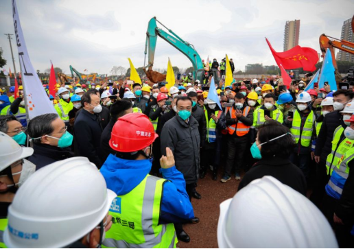 2月1日,中建集團(tuán)黨組書記、董事長(zhǎng)周乃翔趕赴武漢,與鄭學(xué)選一起調(diào)研火神山醫(yī)院工地。周乃翔提出,要不辱使命、不負(fù)眾望、不惜代價(jià),以高標(biāo)準(zhǔn)、高質(zhì)量圓滿建成火神山醫(yī)院的實(shí)際行動(dòng),為打贏疫情防控阻擊戰(zhàn)貢獻(xiàn)中建力量。