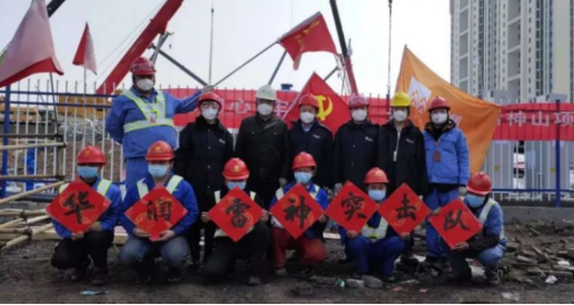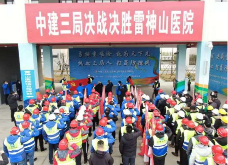 1月28日,中建三局雷神山醫(yī)院項(xiàng)目指揮部火速成立臨時(shí)黨委,并為黨員突擊隊(duì)、青年突擊隊(duì)授旗。鄭學(xué)選在動(dòng)員講話中指出,這是個(gè)不平凡的春節(jié),越是艱難,越能體現(xiàn)三局人的擔(dān)當(dāng)和精神。