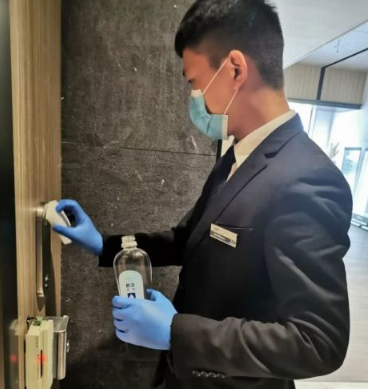 華僑城(物業(yè))集團(tuán)有限公司深圳龍華分公司護(hù)管隊(duì)長(zhǎng)張博在給電梯消毒。