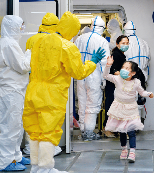 石油石化、電力、通信、糧油、航空運(yùn)輸?shù)然A(chǔ)保障型央企把做好保供工作作為首業(yè)首責(zé),強(qiáng)化擔(dān)當(dāng)意識(shí)、周密組織生產(chǎn)、全力保障供應(yīng),優(yōu)先保障重點(diǎn)地區(qū)需要,合力筑起抗擊疫情的堅(jiān)強(qiáng)后盾。圖為2020年2月5日晚,乘坐東方航空公司包機(jī)從新加坡回武漢的一名剛下飛機(jī)的小姑娘跟地服人員打招呼。當(dāng)晚,從日本大阪和新加坡飛來的國(guó)航和東航的兩架民航飛機(jī)在武漢天河國(guó)際機(jī)場(chǎng)降落,370名湖北人終于回家。 湖北日?qǐng)?bào)全媒記者 魏錸/攝