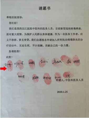 得知發(fā)生疫情,國藥漢江醫(yī)院中醫(yī)科主任郭瑋帶動醫(yī)院同事,第一個請愿并莊嚴地按下紅手印:無論生死,不計報酬!在進入病區(qū)當天他才告知家人,顧不上年僅8歲的兒子和患有嚴重的心臟病的媽媽,為了發(fā)揮中醫(yī)在治療中的優(yōu)勢,她堅持每天為患者看舌苔、把脈,把中西醫(yī)結合運用到極致,將患者病情控制好。腰椎間盤突出癥的老毛病令她常常彎著腰不能動,但她仍帶病進入醫(yī)學隔離區(qū)連續(xù)工作6天,領導提出讓她撤下來休息,可她說:“病人需要我,我能行!”