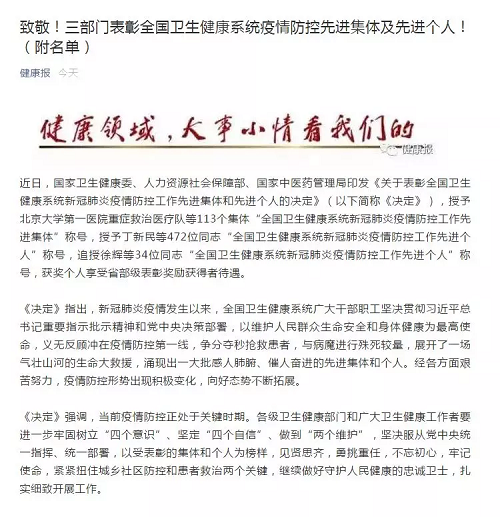今日,國家衛(wèi)生健康委、人力資源社會(huì)保障部、國家中醫(yī)藥管理局印發(fā)《關(guān)于表彰全國衛(wèi)生健康系統(tǒng)新冠肺炎疫情防控工作先進(jìn)集體和先進(jìn)個(gè)人的決定》。