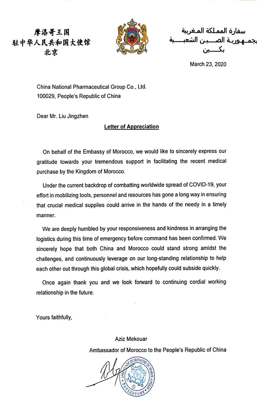 3月26日晚,國藥嘉遠(yuǎn)收到了一封摩洛哥大使對(duì)國藥集團(tuán)董事長劉敬禎的感謝信,感謝國藥在防疫物資供應(yīng)方面對(duì)摩洛哥提供的巨大幫助。這封信的背后,是國藥國際所屬國藥嘉遠(yuǎn)員工72小時(shí)廢寢忘食的奮戰(zhàn)。