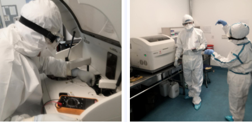 維修機器刻不容緩,但接觸殘存患者體液樣本的設備,意味著要面臨極大的感染風險。關鍵時刻,彰顯“國藥”使命擔當,接到求助的專家組組長和法語翻譯沒有分秒的遲疑,立即深入維修一線;同時,國藥國際國內(nèi)項目負責人緊急聯(lián)系設備廠家,提供遠程支持。