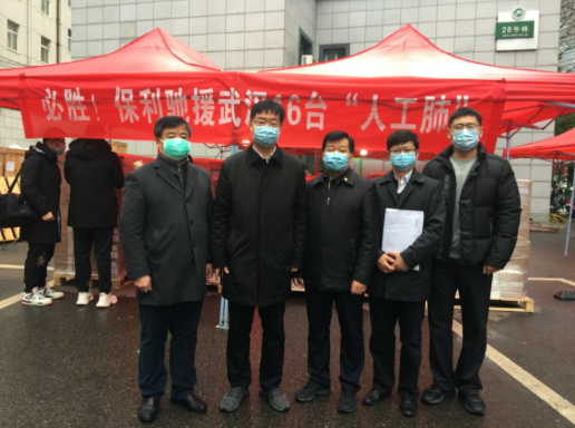 2月28日上午,曾兵(右二)在武漢同濟(jì)醫(yī)院16臺(tái)ECOM捐贈(zèng)現(xiàn)場(chǎng)。