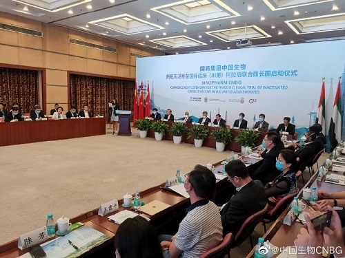 當日,國藥集團中國生物新冠滅活疫苗國際臨床(Ⅲ期)阿拉伯聯(lián)合酋長國啟動儀式在中國北京、武漢、阿聯(lián)酋阿布扎比三地,以視頻會議的方式同步舉行,阿聯(lián)酋衛(wèi)生部長向中國生物頒發(fā)了臨床試驗批準文件。