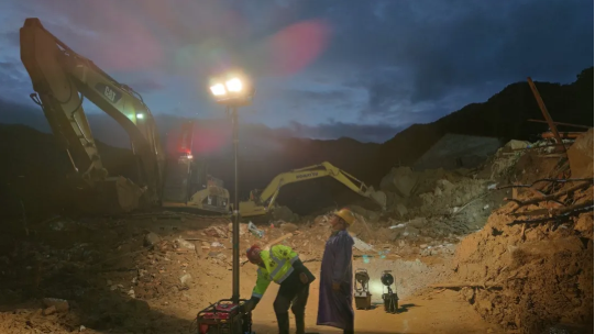 應(yīng)急發(fā)電車照明范圍有限,需要配合救援需求適當(dāng)移動。33名搶險隊(duì)員早已渾身濕透,在一片泥濘中繼續(xù)堅(jiān)守,時刻保障現(xiàn)場照明用電。