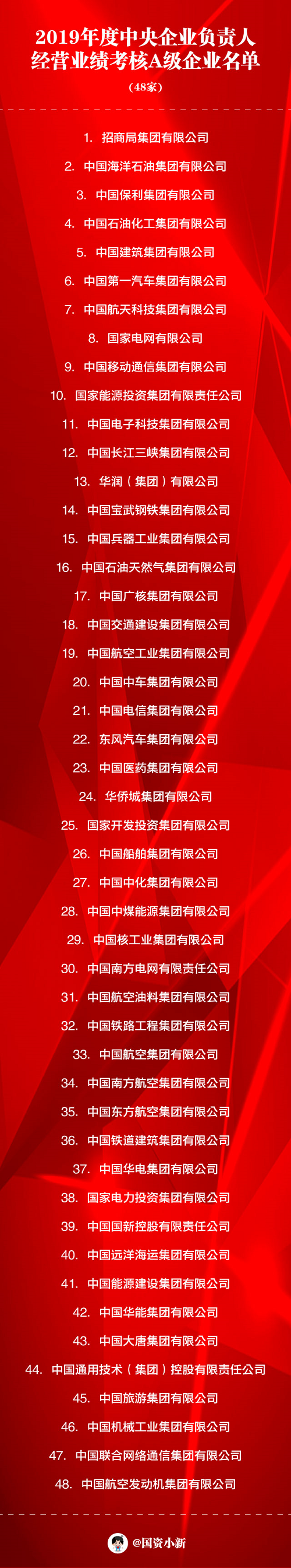 根據(jù)《中央企業(yè)負責(zé)人經(jīng)營業(yè)績考核辦法》,2019年度中央企業(yè)負責(zé)人經(jīng)營業(yè)績考核結(jié)果已經(jīng)國資委黨委會議審議通過,現(xiàn)將A級企業(yè)名單通報如下: