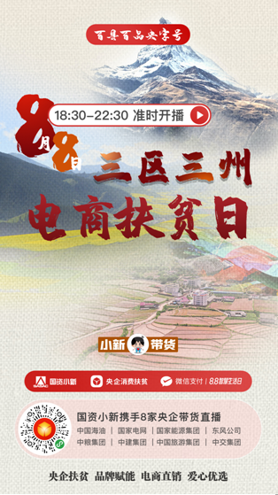 8月8日18:30至22:30,中國交建黨委常委、副總裁裴岷山,中國海油扶貧辦主任宋瑞林,國家電網(wǎng)扶貧辦主任張蓮瑛,國家能源集團(tuán)戰(zhàn)略規(guī)劃部主任魏慎洪,東風(fēng)公司扶貧辦副主任劉鵬,中糧可口可樂飲料有限公司黨委書記、CEO慶立軍,中建集團(tuán)中建二局紀(jì)委書記鄧小林,中國旅游集團(tuán)旅游服務(wù)有限公司董事、紀(jì)委書記胡志敏將走進(jìn)“百縣百品央字號(hào)——‘三區(qū)三州’電商扶貧日”微信小程序直播間,帶來“三區(qū)三州”特產(chǎn)好物,講述中央企業(yè)定點(diǎn)扶貧的動(dòng)人故事。