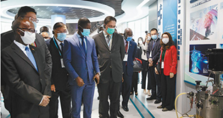 在中國生物博物館,非洲使節(jié)們仔細(xì)觀察生物制品生產(chǎn)儀器。