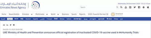 12月9日,據(jù)環(huán)球時報援引阿聯(lián)酋通訊社報道,該國衛(wèi)生和預防部今天宣布對國藥集團中國生物北京生物制品研究所研發(fā)的新冠病毒滅活疫苗進行注冊。這一決定是應此前中國國藥集團下屬的中國生物制藥有限公司(以下簡稱“中國生物”)提出的申請而做出的。