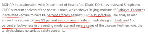聲明稱,參與阿聯(lián)酋國際臨床(Ⅲ期)試驗的3.1萬志愿者來自125個國家和地區(qū)。試驗分析顯示,該疫苗具有99%的中和抗體血清轉(zhuǎn)化率和100%預防中度和重度疾病的有效性,且無明顯副作用。而且相關(guān)研究沒有發(fā)現(xiàn)疫苗存在嚴重的安全隱患。