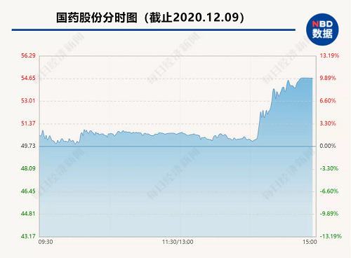 受此消息影響,9日,國藥集團股價大漲,國藥股份(600511.SH)漲停,股價報54.7元,市值413億元。