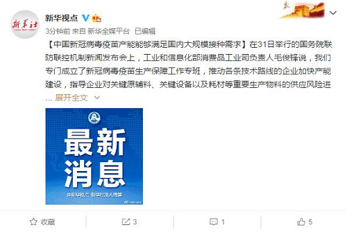 【中國新冠病毒疫苗產(chǎn)能能夠滿足國內(nèi)大規(guī)模接種需求】在31日舉行的國務(wù)院聯(lián)防聯(lián)控機(jī)制新聞發(fā)布會上,工業(yè)和信息化部消費(fèi)品工業(yè)司負(fù)責(zé)人毛俊鋒說,我們專門成立了新冠病毒疫苗生產(chǎn)保障工作專班,推動各條技術(shù)路線的企業(yè)加快產(chǎn)能建設(shè),指導(dǎo)企業(yè)對關(guān)鍵原輔料、關(guān)鍵設(shè)備以及耗材等重要生產(chǎn)物料的供應(yīng)風(fēng)險(xiǎn)進(jìn)行認(rèn)真的研判和分析,做好上下游供需對接,保障新冠病毒疫苗生產(chǎn)供應(yīng)鏈的穩(wěn)定。目前國內(nèi)有18家企業(yè)根據(jù)各自的新冠病毒疫苗研發(fā)進(jìn)展,陸續(xù)開展了產(chǎn)能建設(shè)。到目前為止,國藥集團(tuán)中國生物北京公司等三家企業(yè)已經(jīng)完成了今年的產(chǎn)能建設(shè)任務(wù),特別是國藥集團(tuán)中國生物北京公司已經(jīng)啟動了大規(guī)模生產(chǎn)。隨著新冠病毒滅活疫苗產(chǎn)能的進(jìn)一步提升,以及其他技術(shù)路線企業(yè)產(chǎn)能路線的逐步完成,中國新冠病毒疫苗的生產(chǎn)能力能夠滿足國內(nèi)大規(guī)模接種需求。(記者陳聰、董瑞豐)
