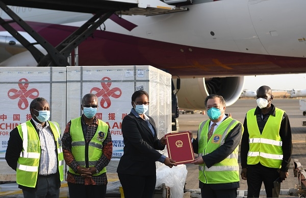 中國駐肯尼亞大使館公參張益俊和肯尼亞衛(wèi)生部常務(wù)副部長蘇珊·莫察切參加了在機(jī)場舉行的疫苗交接儀式。