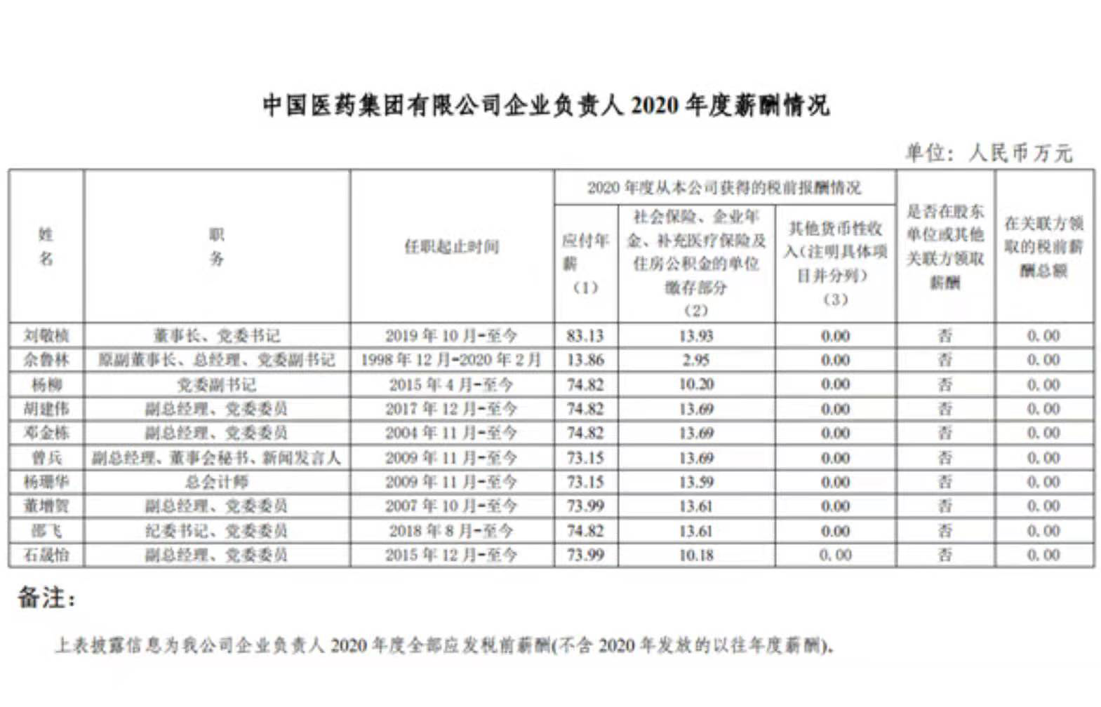 國藥集團(tuán)企業(yè)負(fù)責(zé)人2020年度薪酬情況