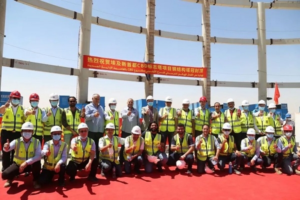 圖為由中建集團承建的埃及新首都CBD標志塔項目鋼結(jié)構(gòu)塔冠封頂現(xiàn)場