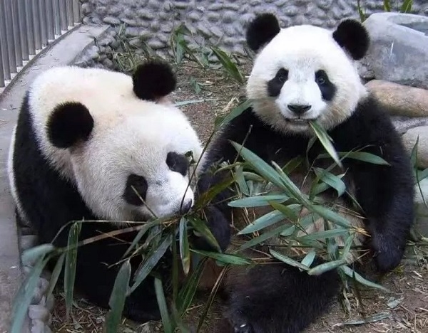 圖為居住于芬蘭艾赫泰里動物園的大熊貓“金寶寶”和“華豹”正在快樂地吃竹子
