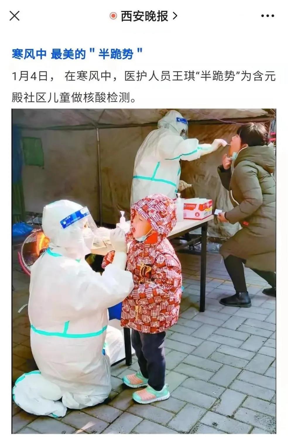 在西安含元殿社區(qū)的核酸檢測點(diǎn),一位小朋友向連續(xù)工作8個(gè)小時(shí)的通用技術(shù)國中康健所屬西安電力醫(yī)院護(hù)士王琪走來。王琪就這樣半跪下來和小孩保持同等高度,溫柔地安撫并快速采集咽拭子。寒風(fēng)中,最美的“半跪姿”被捕捉下來。