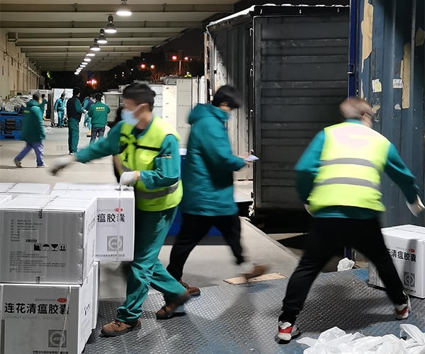 4月2日晚10點,20余輛藥品配送車載滿首批共計2萬件、800萬盒連花清瘟膠囊,抵達位于上??祵幝返膰幬锪鱾}儲庫區(qū)。早已在這里做好準備的國藥物流人員迅速開始卸貨、入庫、轉運。4月3日凌晨,這批連花清瘟藥品已陸續(xù)送往浦東、楊浦等區(qū)的醫(yī)療機構和社區(qū)衛(wèi)生服務中心,緩解當前的燃眉之急。