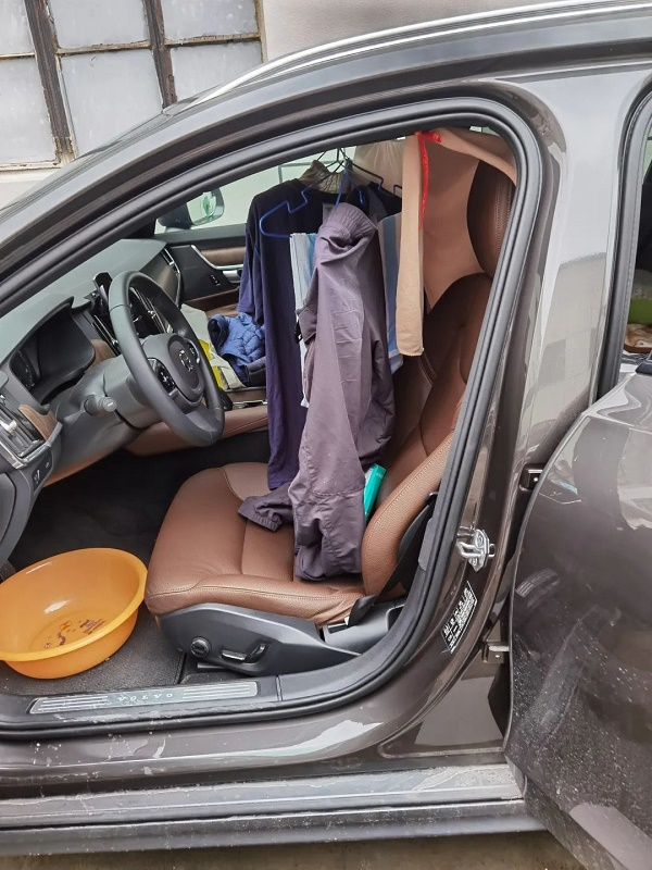 打開車門,放平后座,蓋張?zhí)鹤?,這便是“床”。再往駕駛座位下塞個(gè)盆、上面掛幾件衣服,這便是“陽臺(tái)”。