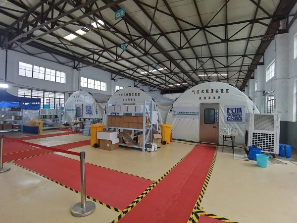 3月15日,幾輛14米長(zhǎng)的大卡車滿載氣膜艙體、核酸提取儀等設(shè)備,駛進(jìn)松江區(qū)九亭鎮(zhèn)伴亭東路的一處廠房。大家擼起袖子、當(dāng)起工人,硬是在這個(gè)“毛坯房”里建起一座生物安全標(biāo)準(zhǔn)不輸傳統(tǒng)實(shí)驗(yàn)室的氣膜實(shí)驗(yàn)室。