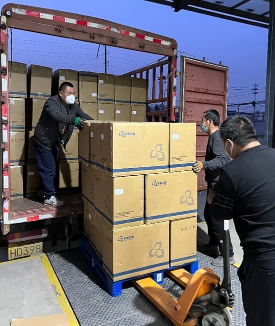 提貨地點在距離倉庫79公里的北六環(huán)外,凌晨1:52,集結車輛準時出發(fā),凌晨3:10到達提貨地點,還在發(fā)著燒的王學強馬不停蹄地指揮工人清點貨物、裝車封車,直到早晨6:12,裝滿兩輛大車的抗原試劑盒順利送達倉庫,等待卸貨入庫,截至早晨7:47全部商品完成入庫驗收。