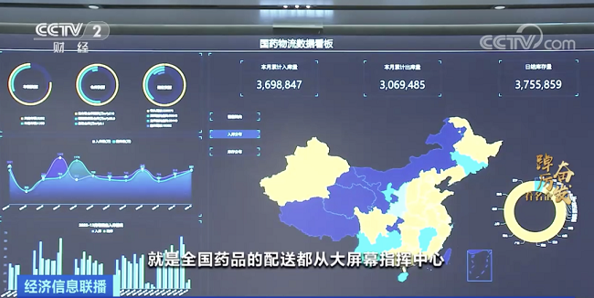 中國醫(yī)藥集團(tuán)有限公司黨委書記 董事長 劉敬楨:這是整個(gè)國藥物流數(shù)據(jù)的一個(gè)智慧控制指揮中心,全國藥品的配送都從大屏幕指揮中心來進(jìn)行統(tǒng)一的指揮調(diào)度配送,從去年(2022年)12月份開始到目前,我們累計(jì)供應(yīng)了各類醫(yī)用物資、藥品,包括防疫物資,現(xiàn)在達(dá)到了6.9億件。